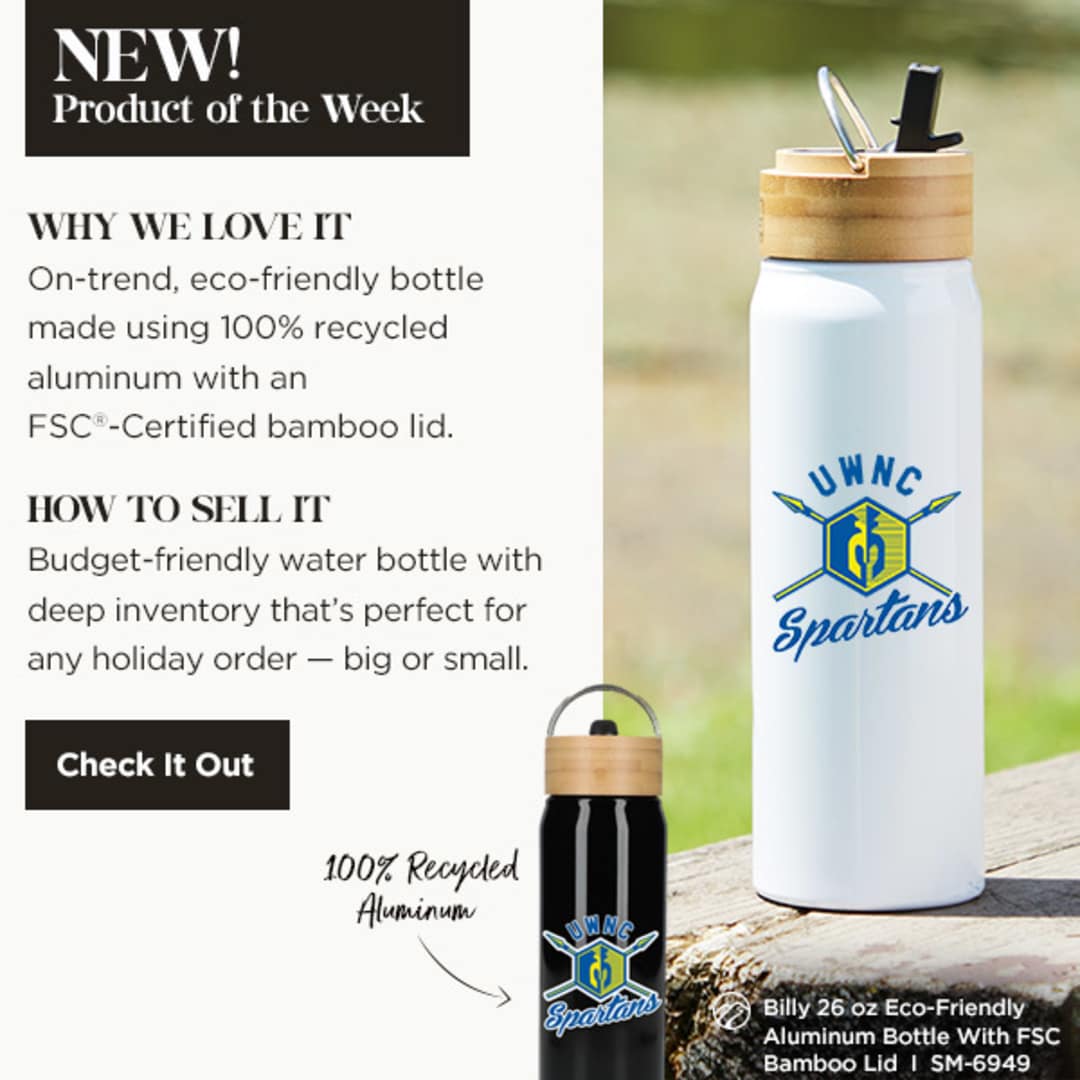 La bouteille Billy ECO en aluminium de 77 cl est fabriquée à partir d’aluminium 100 % recyclé post-consommation. Elle est dotée d’un couvercle vissé en bambou certifié FSC®, résistant aux éclaboussures, d’une paille intégrée à large ouverture pour un nettoyage et un remplissage faciles, ainsi que d’une dragonne en acier inoxydable durable. Son extérieur est doté d’une finition brillante tendance. Cette bouteille de sport de 77 cl est lavable à la main uniquement et s’adapte à la plupart des porte-gobelets standards.
