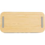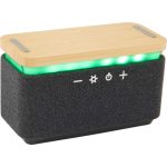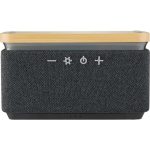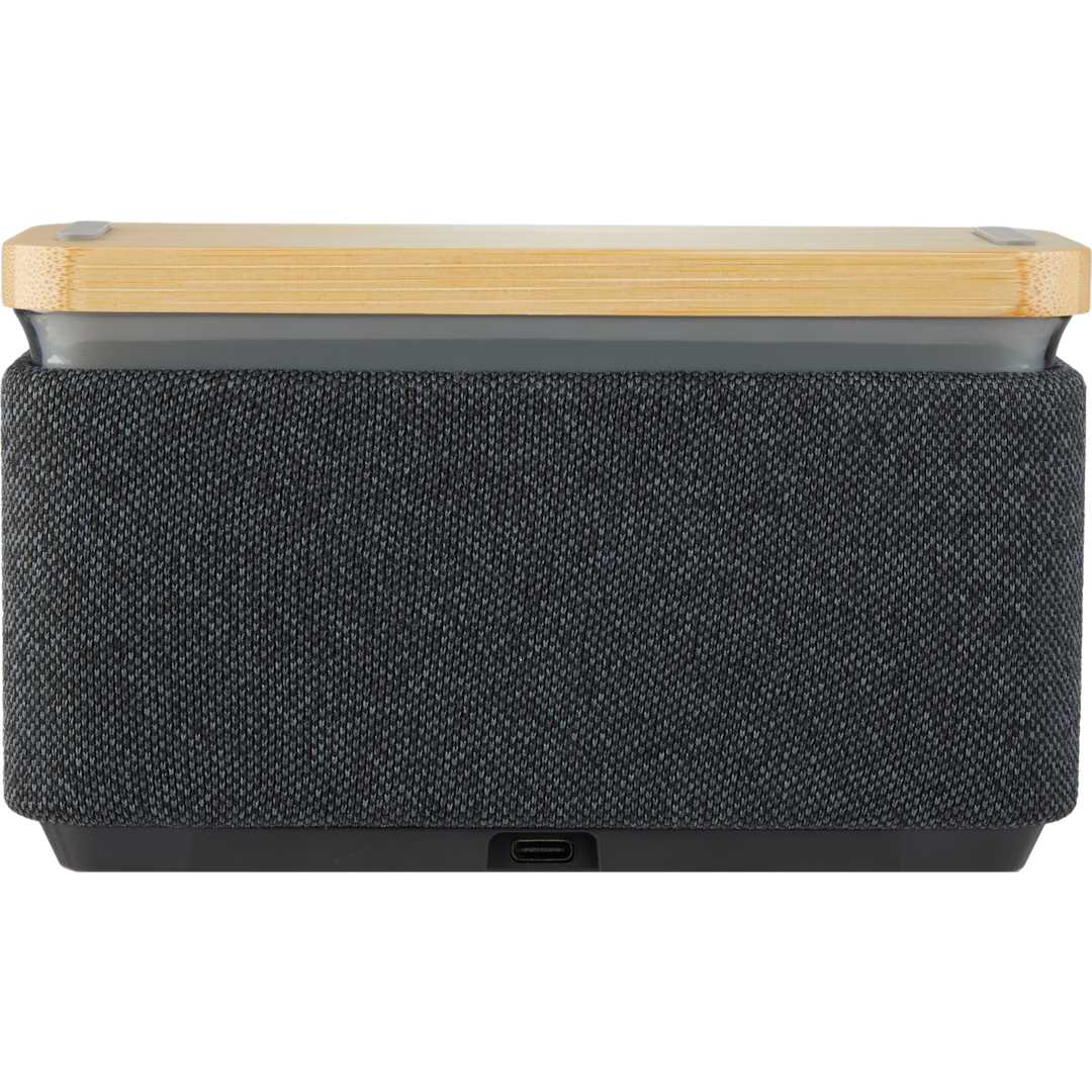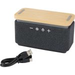 L’enceinte Boost en bambou certifié FSC® avec revêtement en tissu est idéale pour un bureau ou un plan de travail. Son design tendance, mêlant bambou et tissu RPET, et ses lumières multicolores ne manqueront pas d’attirer les regards. Avec sa puissance de 5 watts, elle offre un son cristallin. Son plateau supérieur sert également de chargeur sans fil de 10 watts, compatible avec tous les appareils compatibles. Pour la recharge sans fil, l’enceinte doit être branchée. Sa batterie intégrée de 3 000 mAh assure plus de 6 heures d’écoute. Commandes intégrées pour la musique et la lumière, microphone inclus (Bluetooth® version 5.4) pour une utilisation mains libres. Un câble de charge USB-A vers USB-C de 99 cm est fourni. Le plateau supérieur est en bambou certifié FSC®. Chaque pièce est unique et peut présenter de légères variations dues à la nature du bambou.