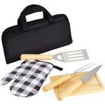 Cet ensemble barbecue cinq pièces comprend une spatule avec décapsuleur intégré, une fourchette et un couteau (tous avec manches en bois), une planche à découper en bois assortie et un gant de barbecue à carreaux noirs et blancs. Le tout est soigneusement rangé dans une housse de transport zippée.